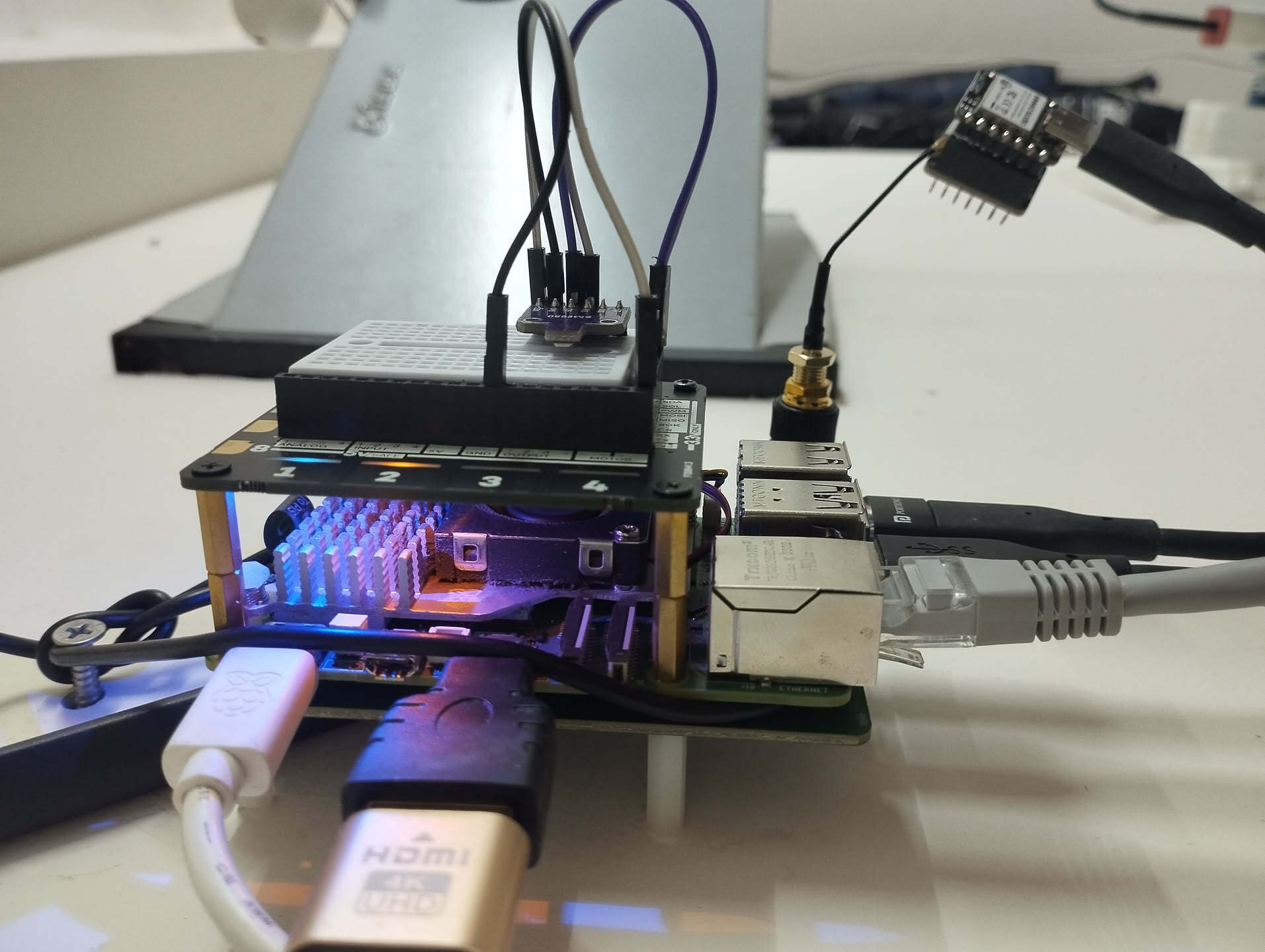 - NRF52840 with a SX1262 transceiver and a dedicated LoRa antenna connected to USB 2.0 for running a Meshtastic node.